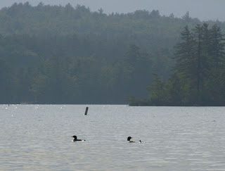 Who knew that the baby loon really does ride on the back of its mother? I found out the other day, two weeks ago when I met these two in our backyard at Kezar Lake in Center Lovell, Maine. I've had a great time watching them this summer and thought you might like to see these beautiful birds!