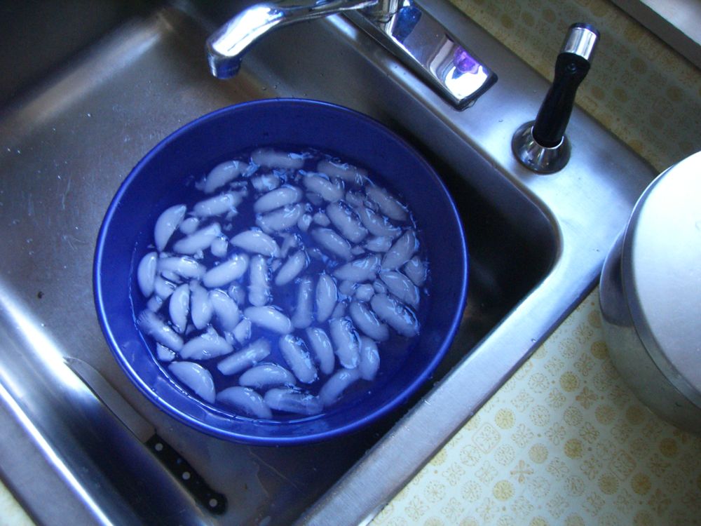 He started by soaking the Great Northern white beans overnight, 6-8 hours. Throw out the water and put the beans in a large pot and cover with duck stock. Add the thyme, bay leaf, bacon, whole garlic sausages, chopped garlic and quartered onions. Set over low heat: simmering until beans are tender, about 1 1/2 hours. This is only the first part of the cassoulet. Now to the meats.