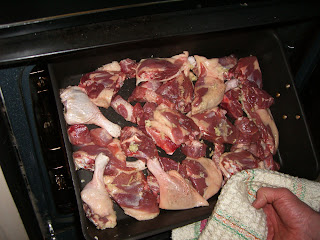 Separate the duck legs and thighs, trimming excess fat, and cut the pork into 2" chunks. Season with salt and pepper and roast at 450 for 45 minutes until browned.
