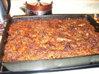 Reduce oven temperature to 300 and cover with fresh bread crumbs. Drizzle the goose fat over the top and bake uncovered for 2 - 3 hours until brown and bubbly.